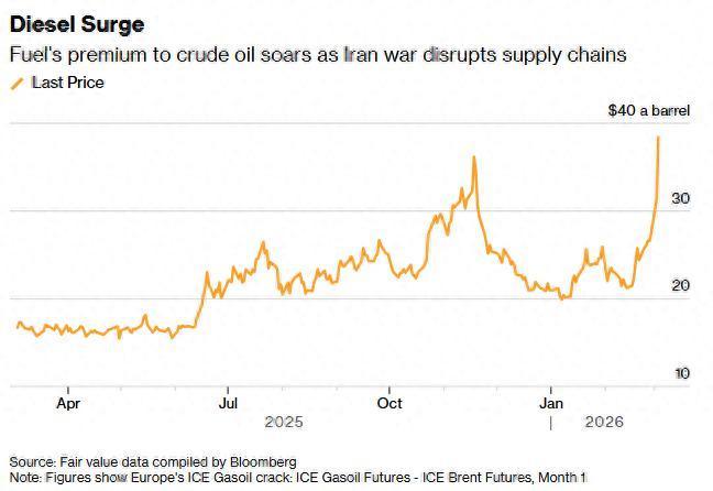 中东战事扰乱供应链,柴油相对原油溢价飙涨
